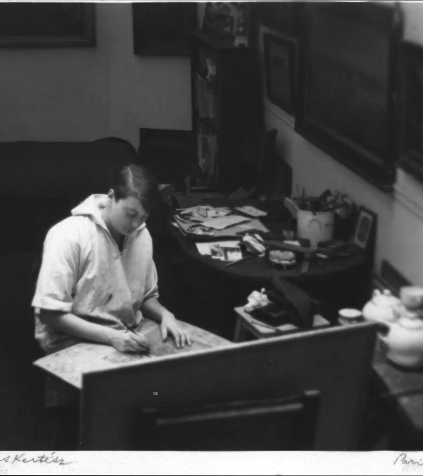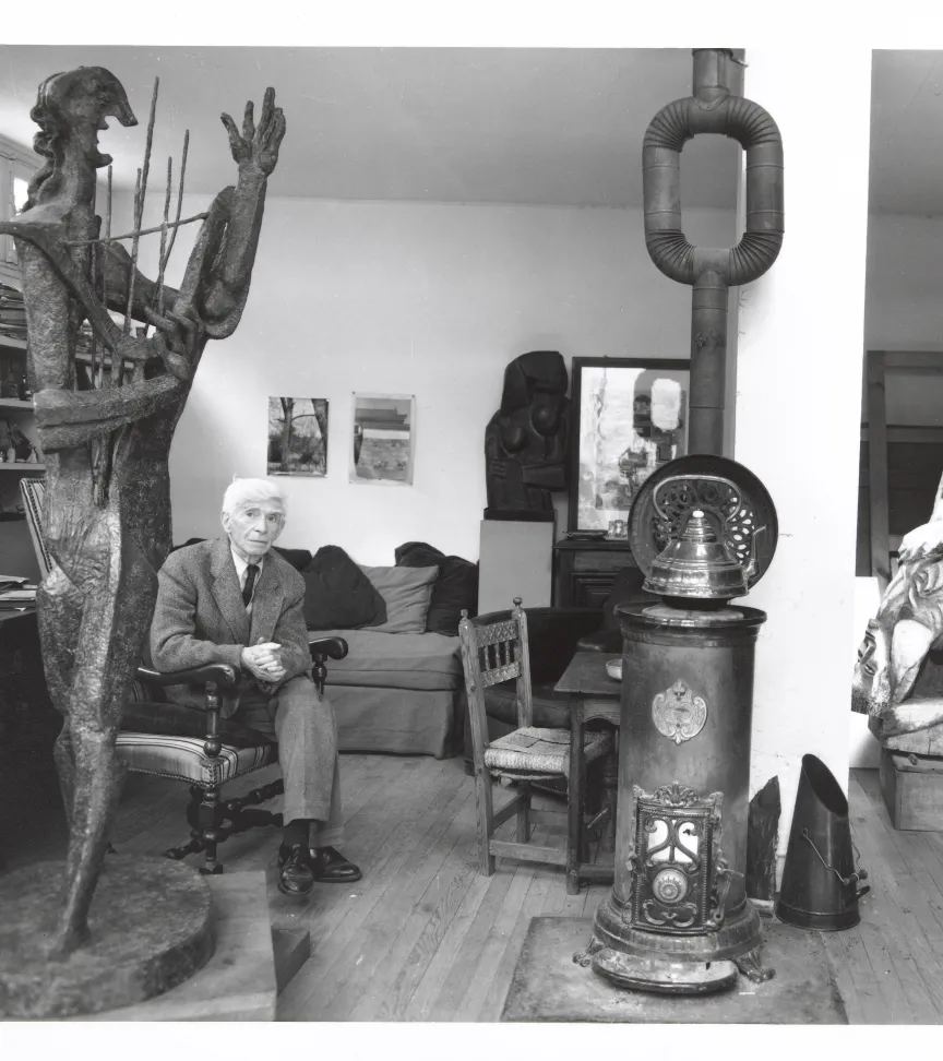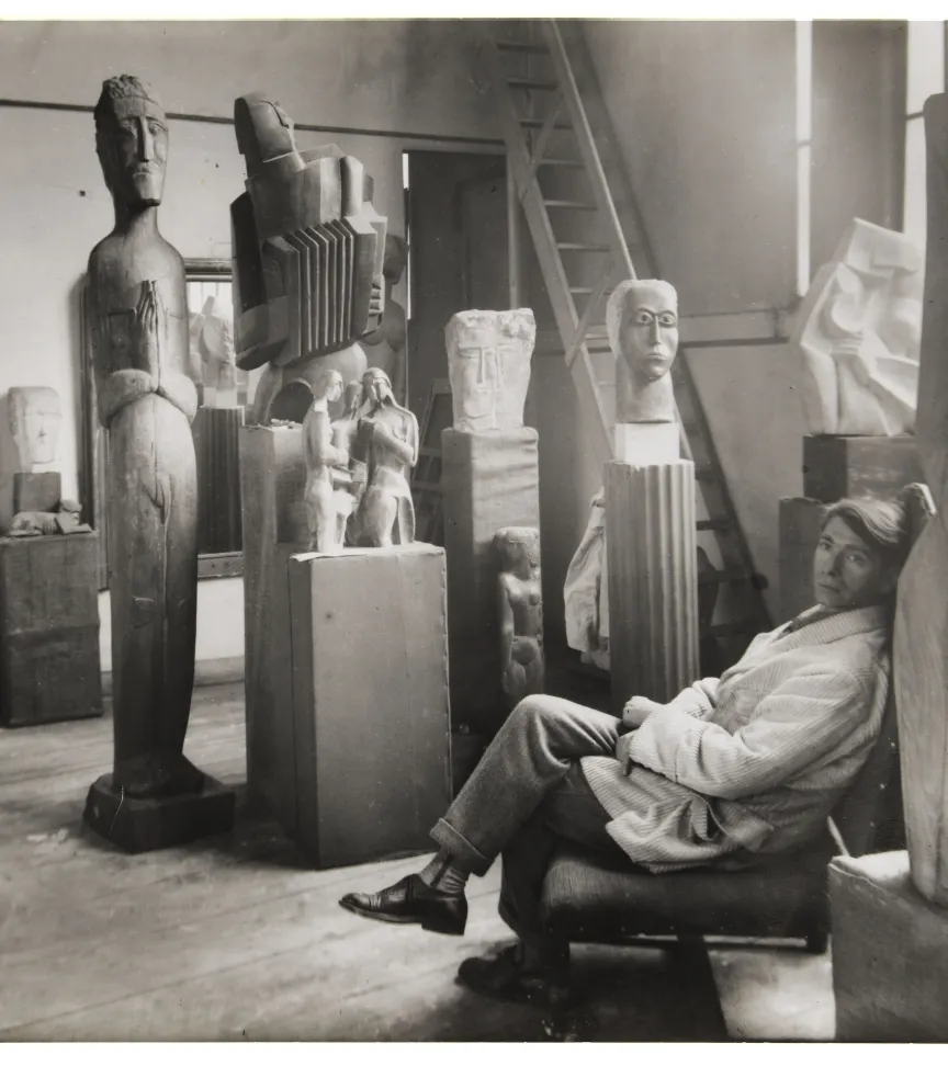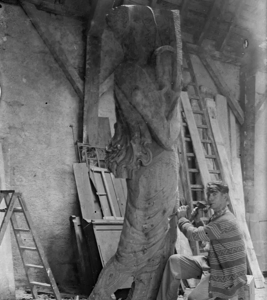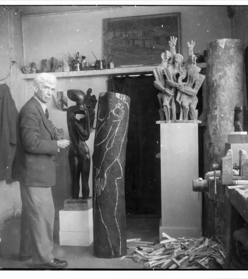 Les photographiesOssip Zadkine dans son atelier avec le dessin préparatoire de Pomone sur une grume