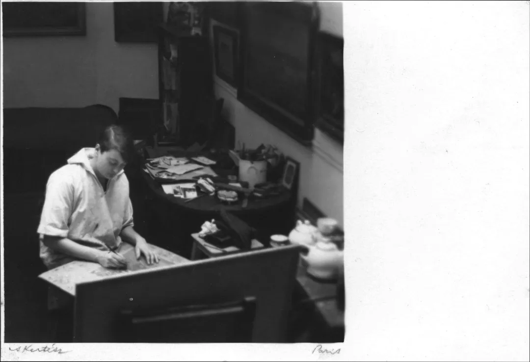 Cette très belle photographie d'André Kertész (1894-1985) montre Valentine Prax au travail.