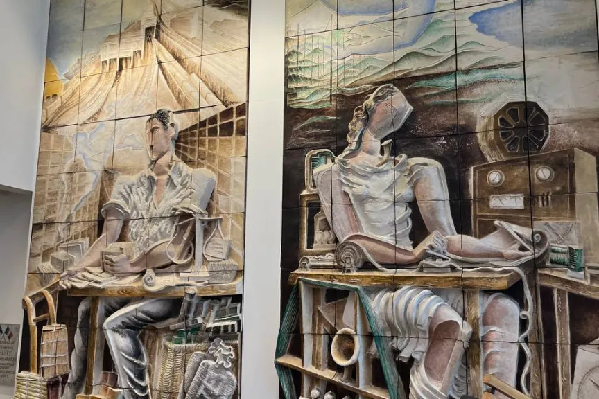 Enfin, empruntez les transports en commun pour rejoindre l’historique bureau central des postes du 20e arrondissement (250 rue des Pyrénées, ouvert du lundi au vendredi de 9h à 19h et le samedi de 9h à 12h30). À l’intérieur prennent place deux grands panneaux en faïence stannifère conçus par Zadkine, en lien avec la Manufacture de Sèvres, entre 1937 et 1938, La Poste aérienne et La Poste terrestre, commandés à l’origine pour le ministère des « PTT » (Postes, Télégraphes et Téléphones) et installés ici depuis 1988.