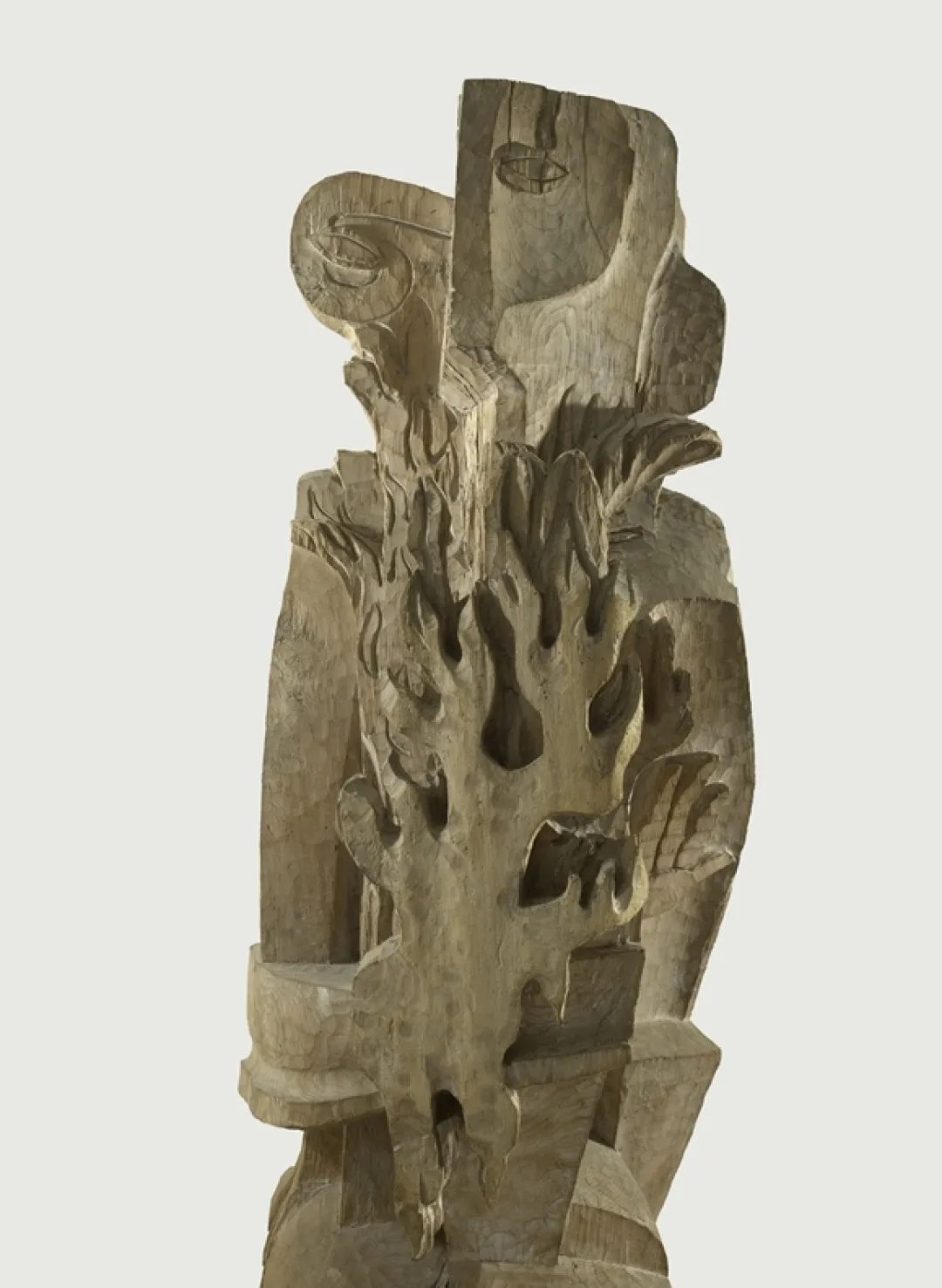 A very subtle play on colours is also evident. A fine, light layer of white has been applied to the surface, and is particularly visible in the hollows and on the base. Although the elm wood has a pinkish aspect, the sapwood area (corresponding to the most recent areas of growth) gives the upper part of the flame a yellow colour. Prometheus, as represented by Zadkine, has just stolen fire in order to give it to man. The flame which he clutches against his chest reaches up to his face. The neoclassicism of the theme - which relates to Greek mythology - and the treatment of the draperies in large scrolls – reminiscent of ancient tunics - are combined here with the direct carving of the wood. Zadkine returned periodically to working with wood, and to his cabinetmaker.
