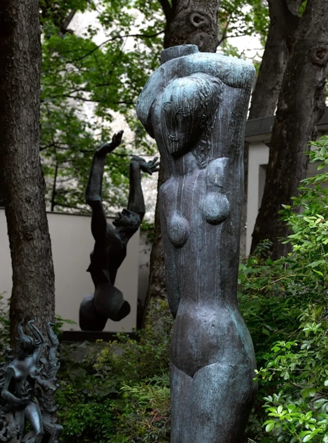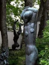 And so the copy presented to the museum – the third of four which were then cast – came into being. This Rebecca is very representative of Ossip Zadkine’s work in the 1920s. Along with other avant-garde sculptors from the beginning of the century, Gaudier-Brzeska, Matisse and Modigliani, Zadkine drew on archaic forms and primitivism to break with the conventions of traditional art. Here Zadkine combines the representation of the body carved directly into the wood of the tree and the free expression of the ancient myth. The character represented resumes the posture of the caryatids which he had previously carved in wood but displays a slender stature with more fluid lines. Presented in the museum garden and blending in with the trees, this work retains "the heady perfume of the forest" to quote his own words.
